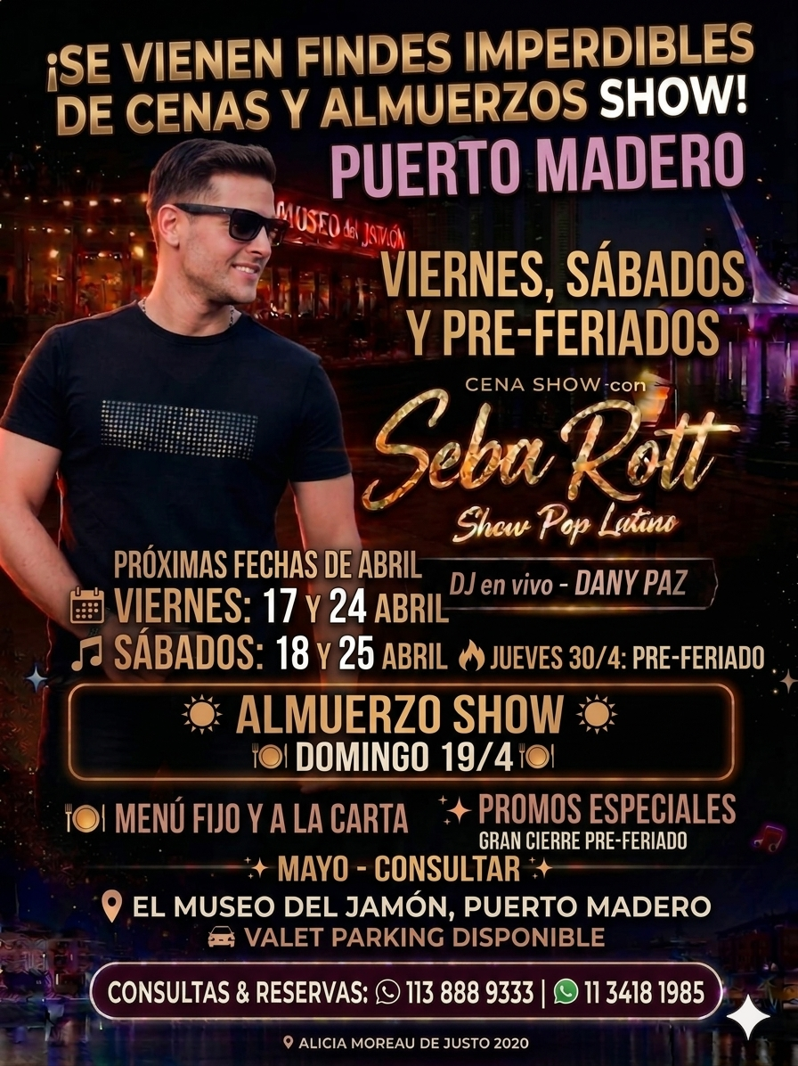 Vení a la CENA SHOW 🥂más DIVERTIDA en el EXCLUSIVO RESTO MUSEO del JAMÓN PUERTO MADERO! Ahora con Noches de Cena Show Viernes Sabados Preferiados + Almuerzo Show los Domingos