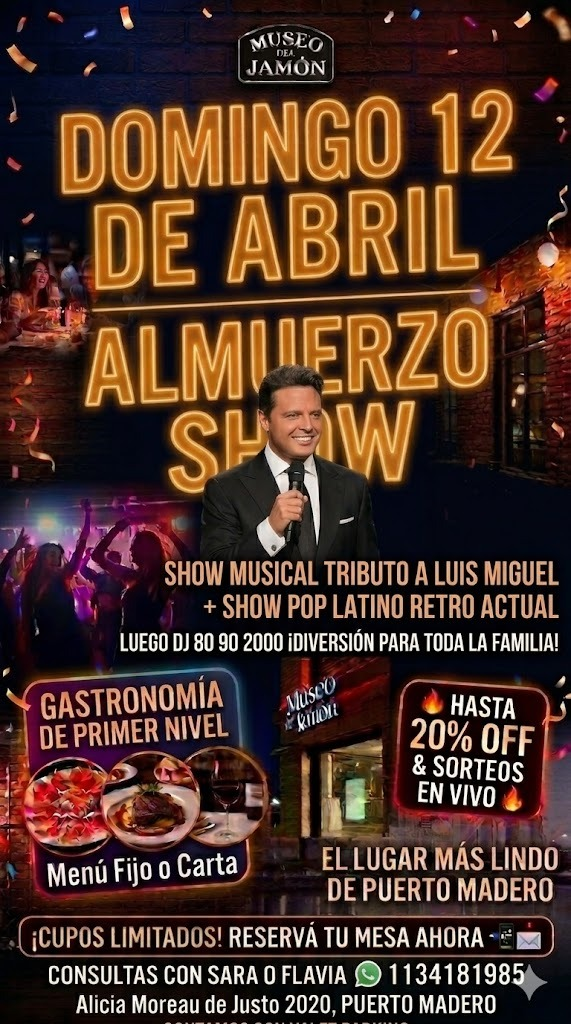 📍 MUSEO DEL JAMÓN - PUERTO MADERO🌙 Abrimos Todos los Viernes, Sábados y Pre-feriados con Cena Show & DJ.☀️ Domingos: Especial Almuerzo Show & DJ.
