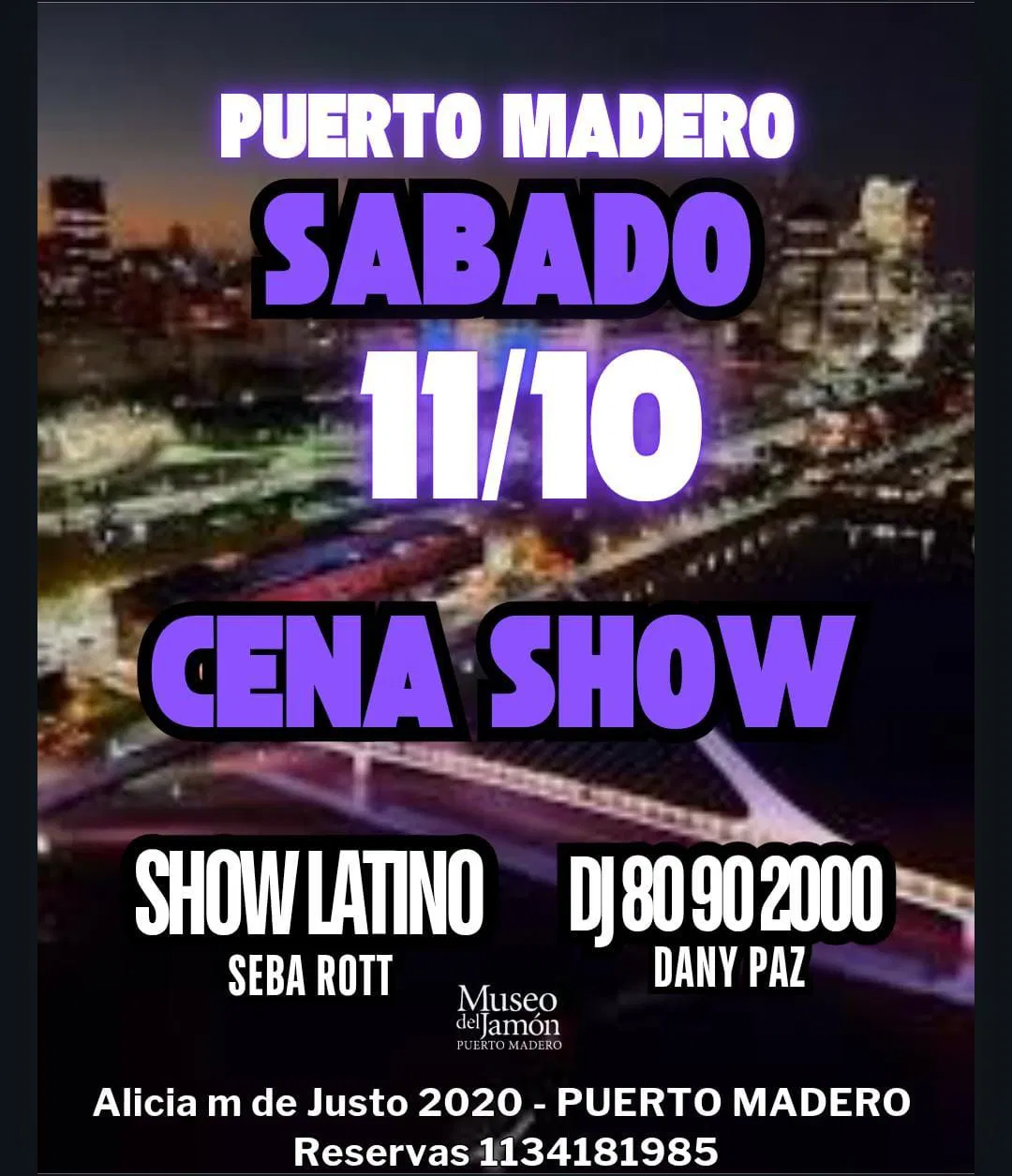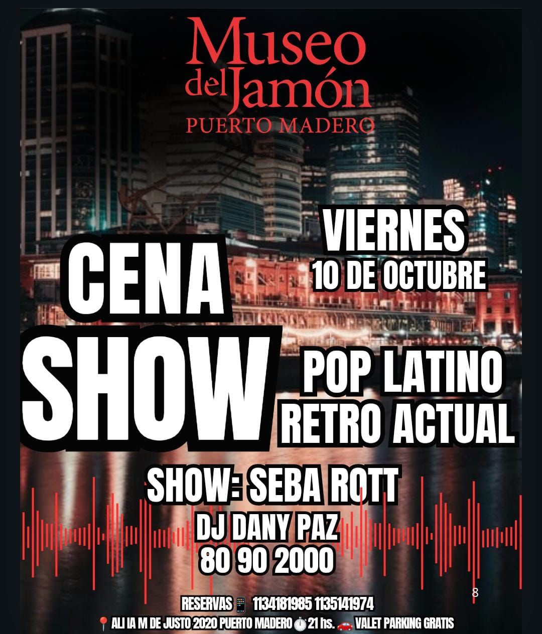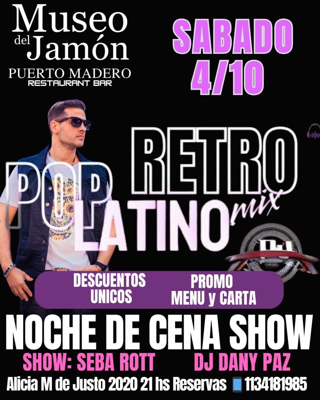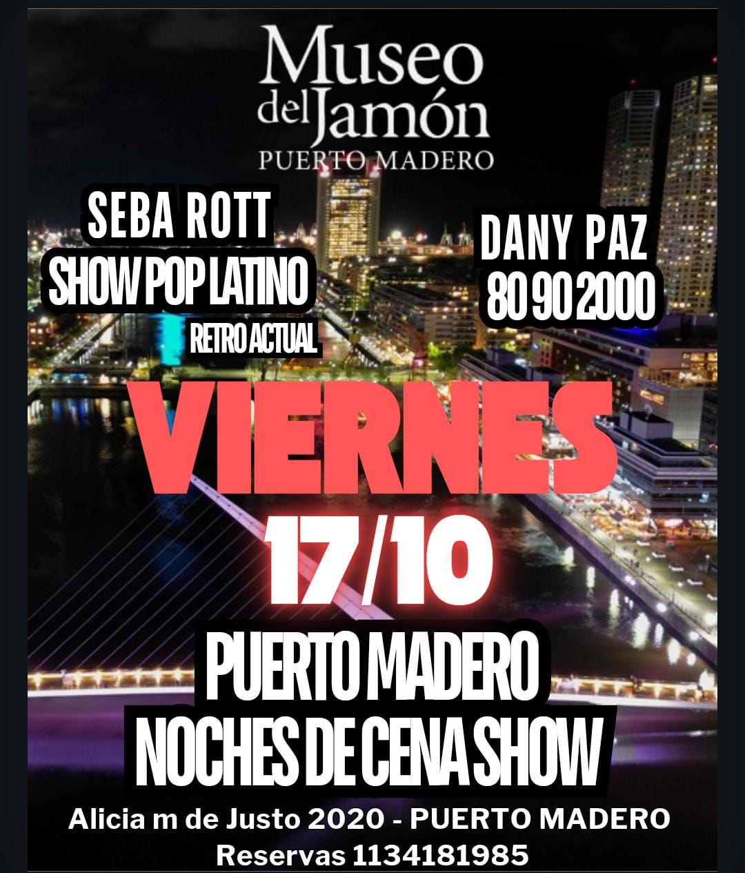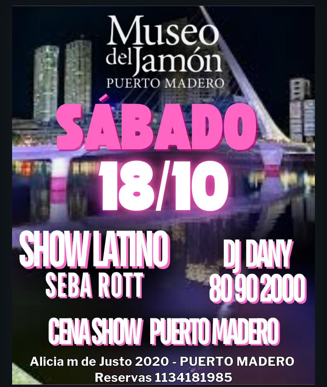 VIERNES 10/10 Te esperamos en el MUSEO DEL JAMON PUERTO MADERO con el Show de Seba Rott Pop Latino Retro Actual Temas como Luismi Ricky Martin Cristian Castro Diego Torres Las Mejores Cumbias de Recuerdo Los Palmeras Rafaga Amar Azul Comanche Lo Mejor de Cuarteto Rodrigo la Konga y más....Al Finalizar Dj Dany Paz con Música a pura Fiesta