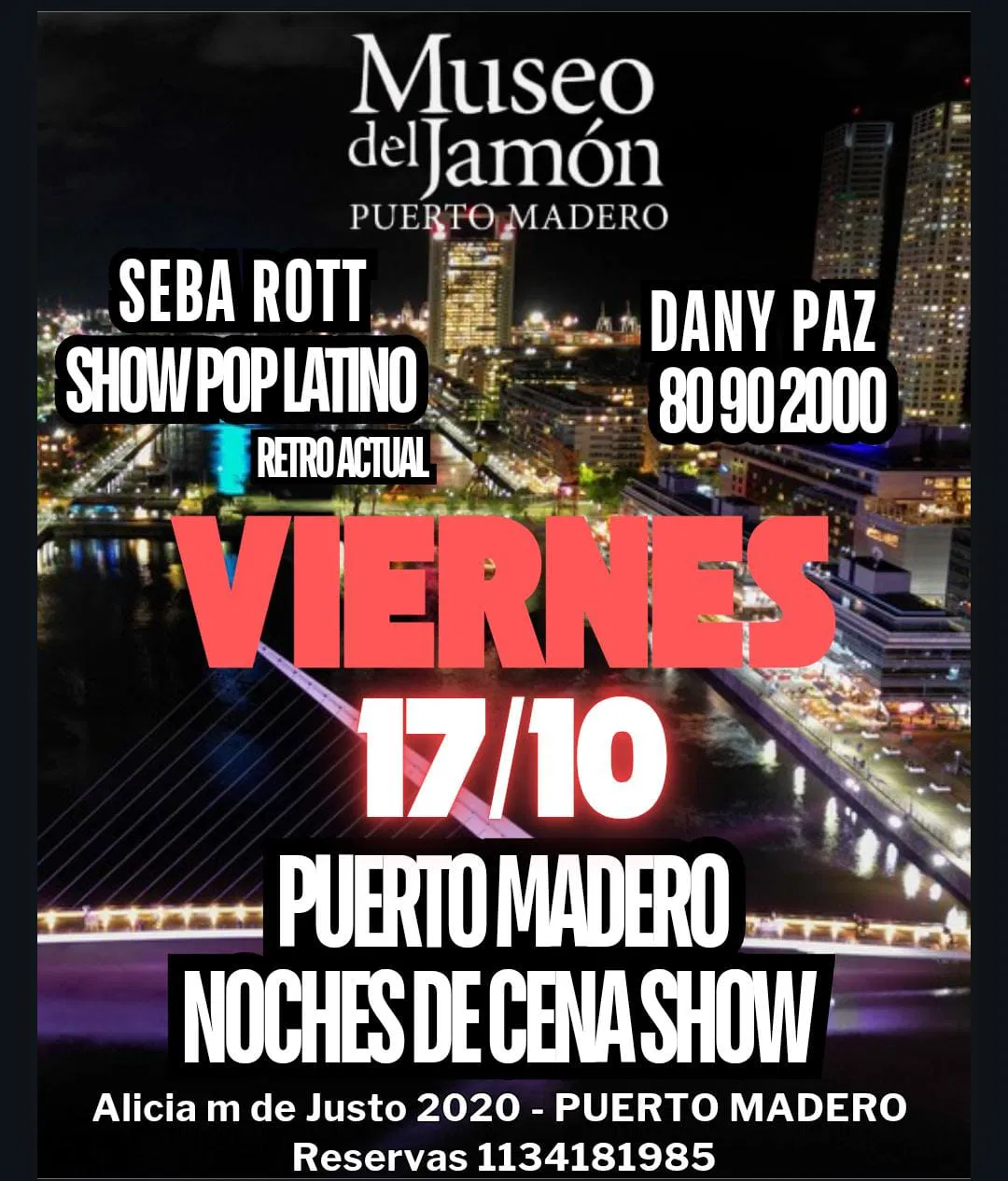 ESTE VIERNES 10/10 Te esperamos en el MUSEO DEL JAMON PUERTO MADERO con el Show de Seba Rott Pop Latino Retro Actual Temas como Luismi Ricky Martin Cristian Castro Diego Torres Las Mejores Cumbias de Recuerdo Los Palmeras Rafaga Amar Azul Comanche Lo Mejor de Cuarteto Rodrigo la Konga y más....Al Finalizar Dj Dany Paz con Música a pura Fiesta