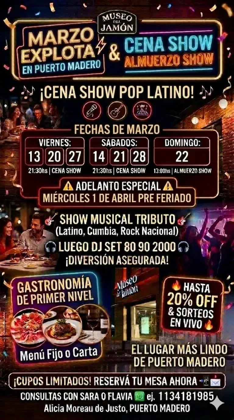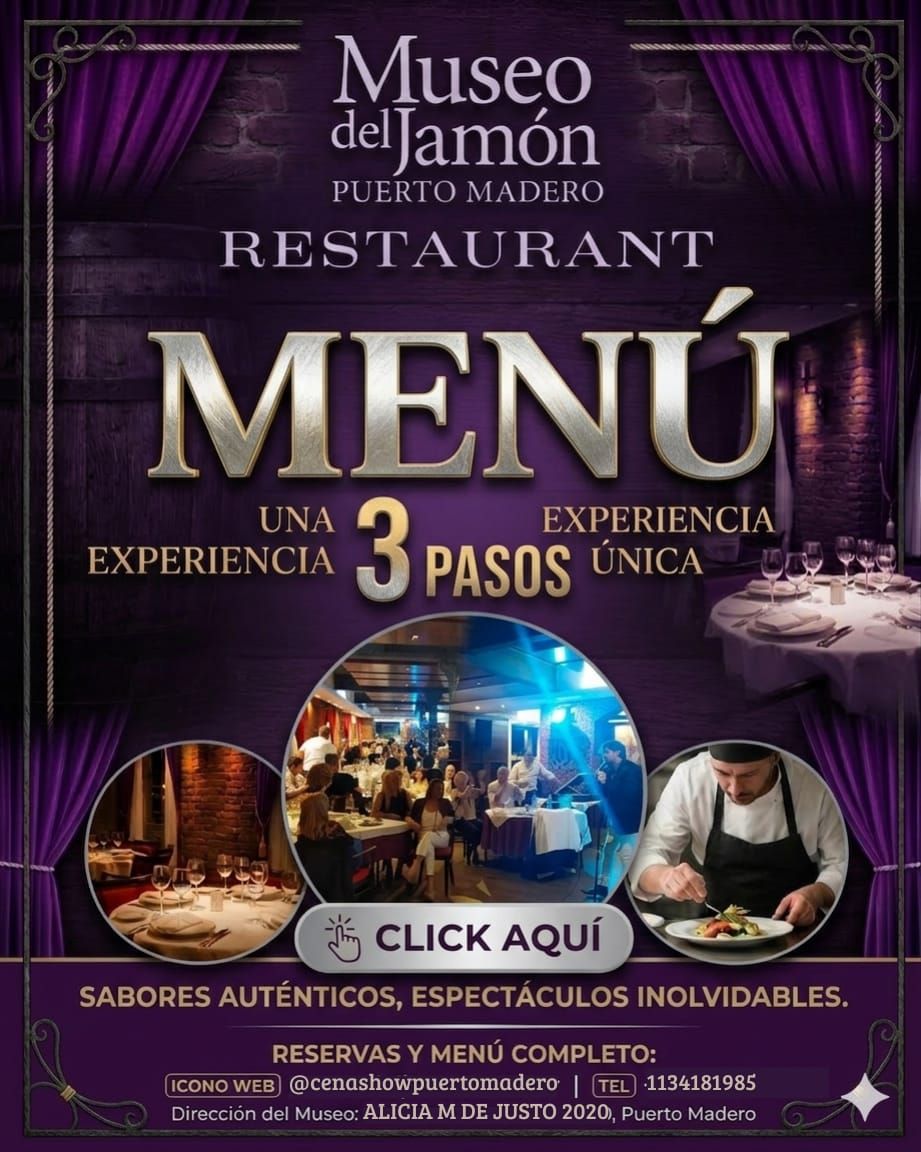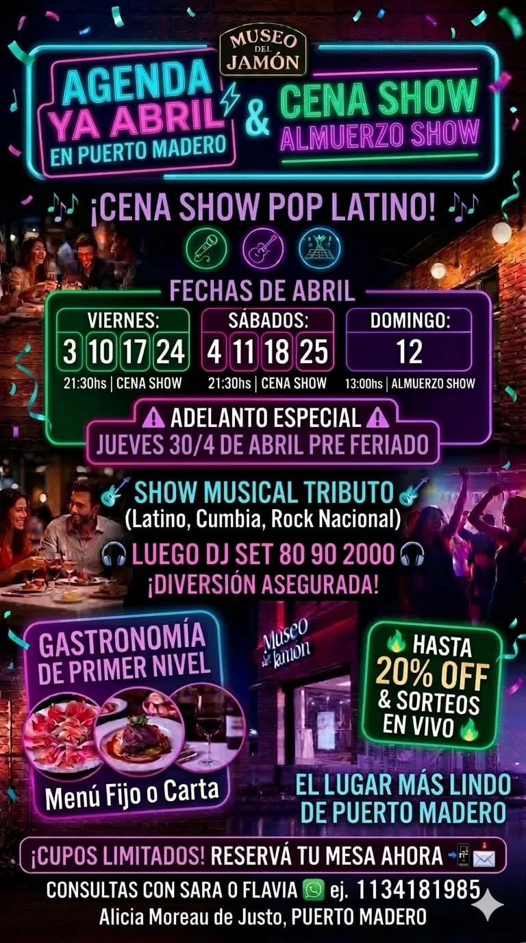 Veni al Lugar mas Lindo de Puerto Madero Gastronomía de primer nivel, los mejores shows en vivo y DJ Latino 80 90 2000 Retro Actual en el Exclusivo MUSEO DEL JAMÓN PUERTO MADERO Ahora con Noches de Diversion Cena Show Viernes Sabados Preferiados y Especiales de Almuerzo Show los Domingos🥂💃☀️