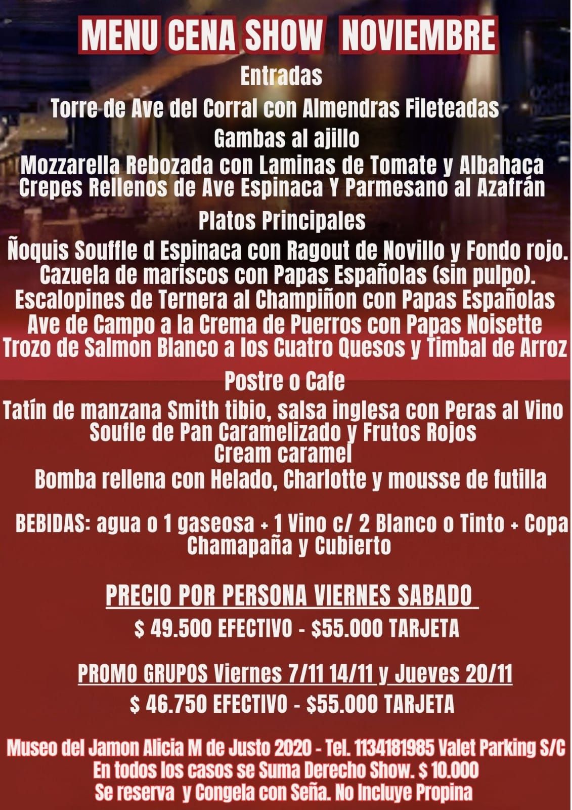 Promos Cena Show Gastronomía Gourmet Menu Fijo o Carta (Adjuntamos Detalle de Menu Fijo. En caso de que quieras comer a la Carta Solicitanos la Info) Las Mesas son Individuales. Contamos con Diferentes Sectores